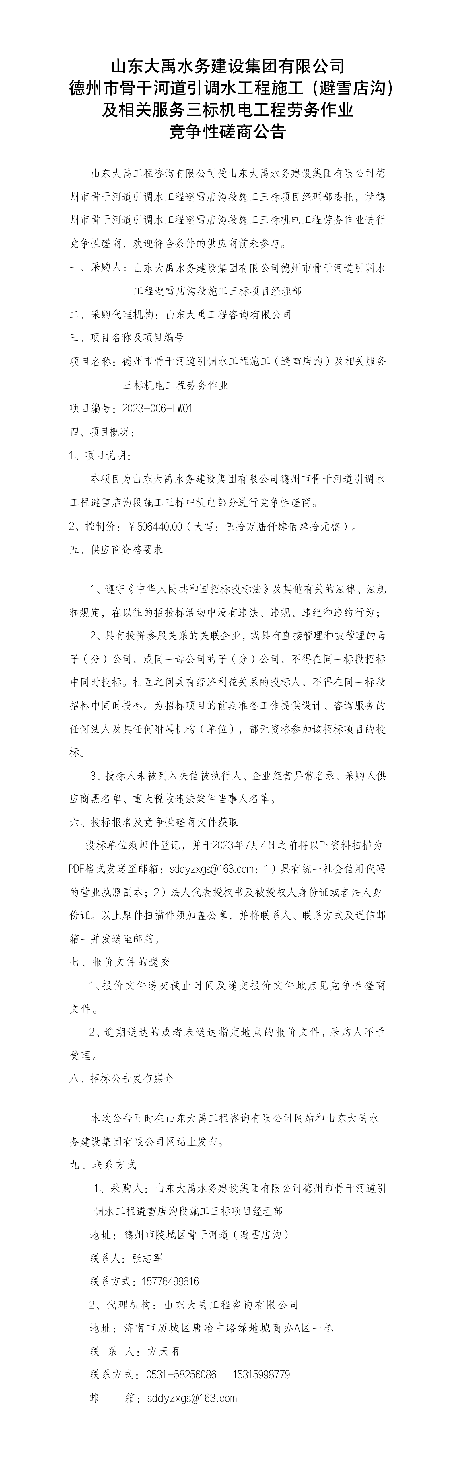 山東大禹水務(wù)建設(shè)集團(tuán)有限公司德州市骨干河道引調(diào)水工程施工(避雪店溝)及相關(guān)服務(wù)三標(biāo)機(jī)電工程勞務(wù)作業(yè)競爭性磋商公告