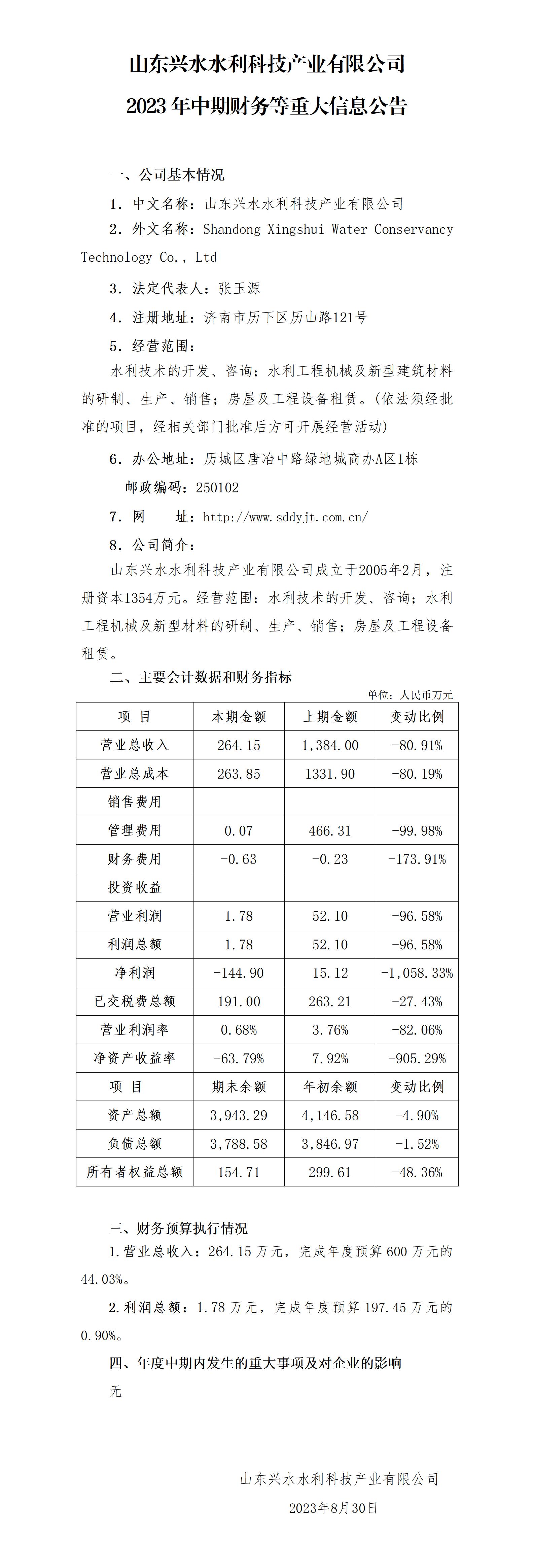 山東興水水利科技產(chǎn)業(yè)有限公司2023年中期財(cái)務(wù)等重大信息公告
