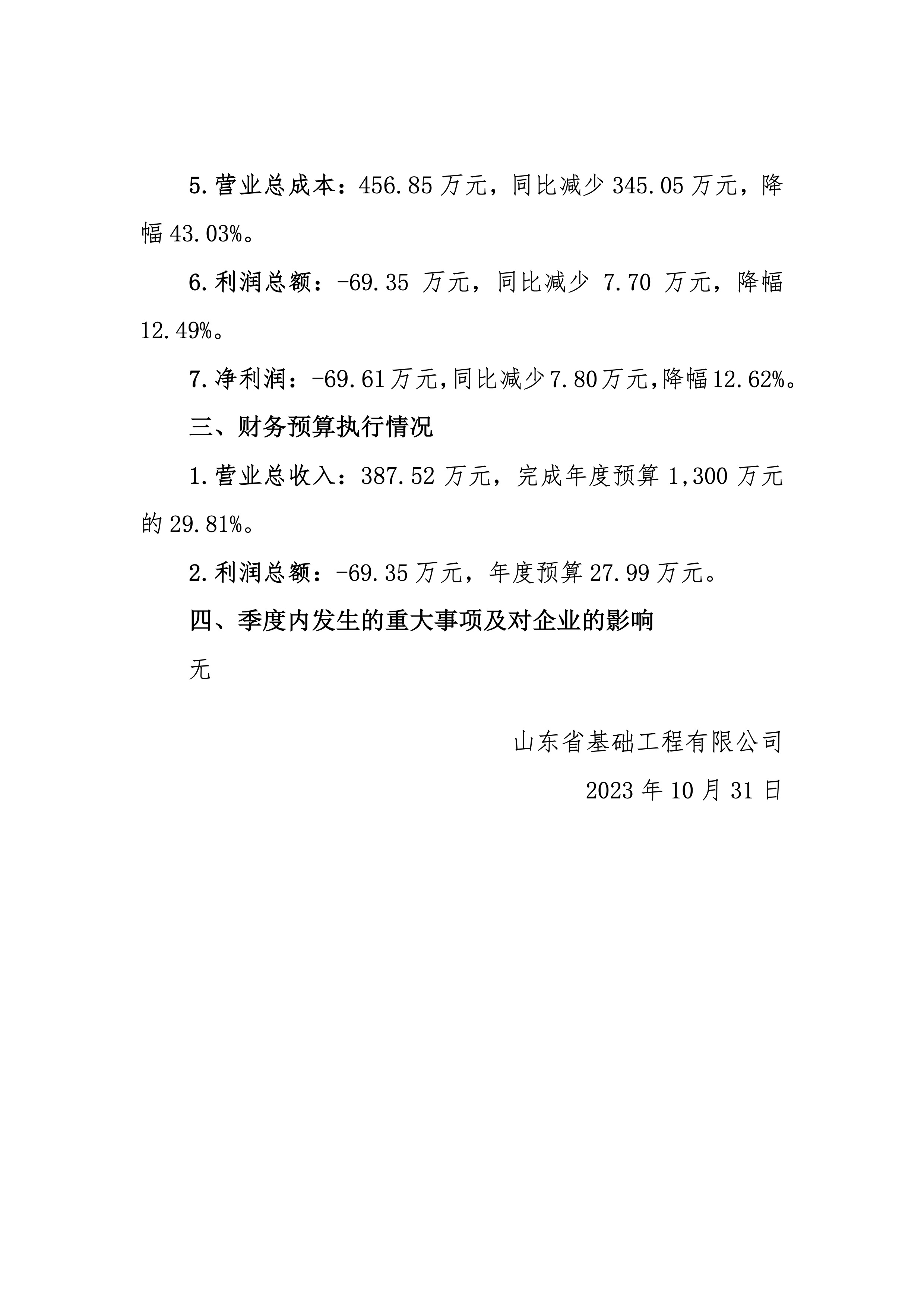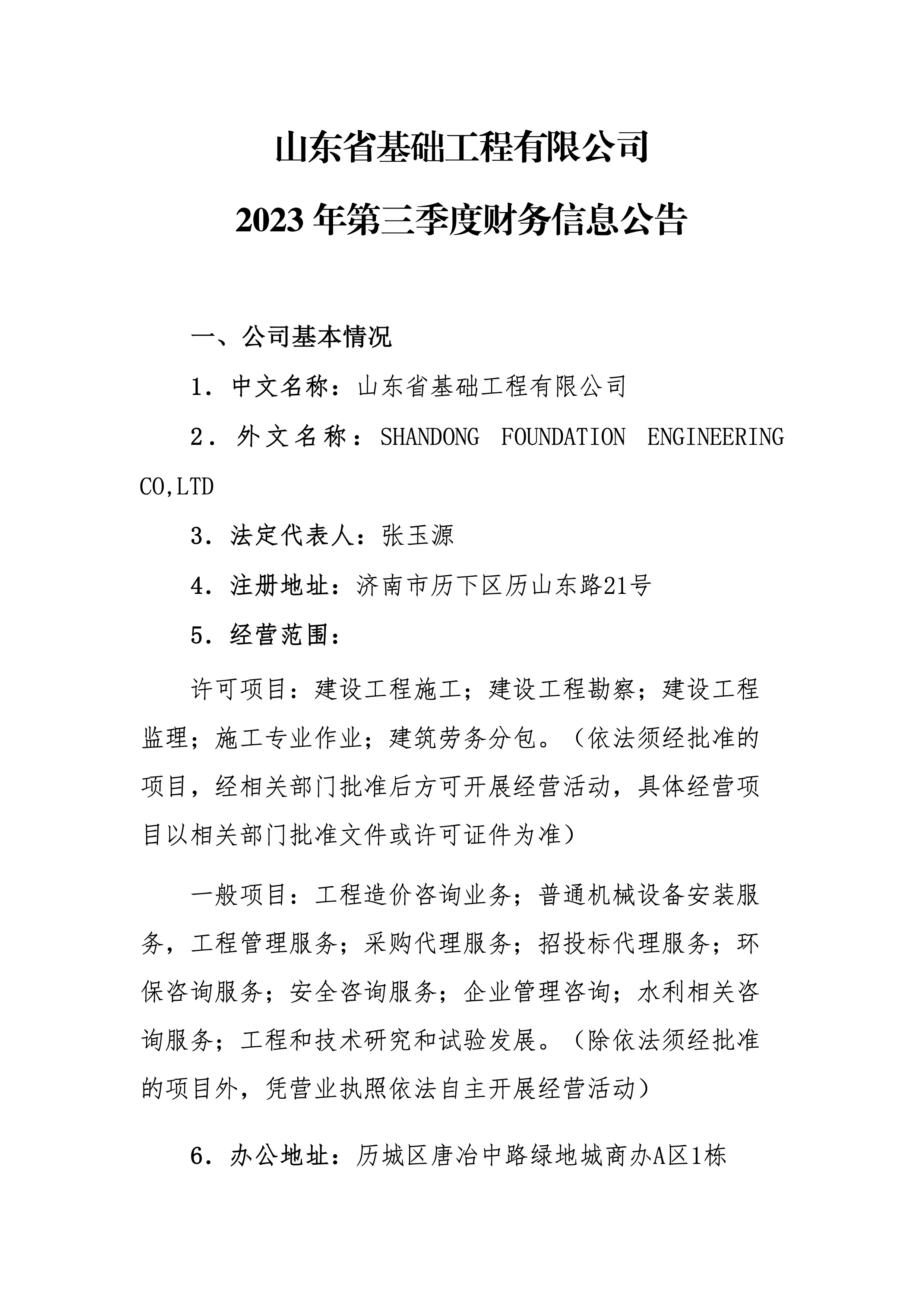 山東省基礎(chǔ)工程有限公司2023年第三季度財(cái)務(wù)信息公告
