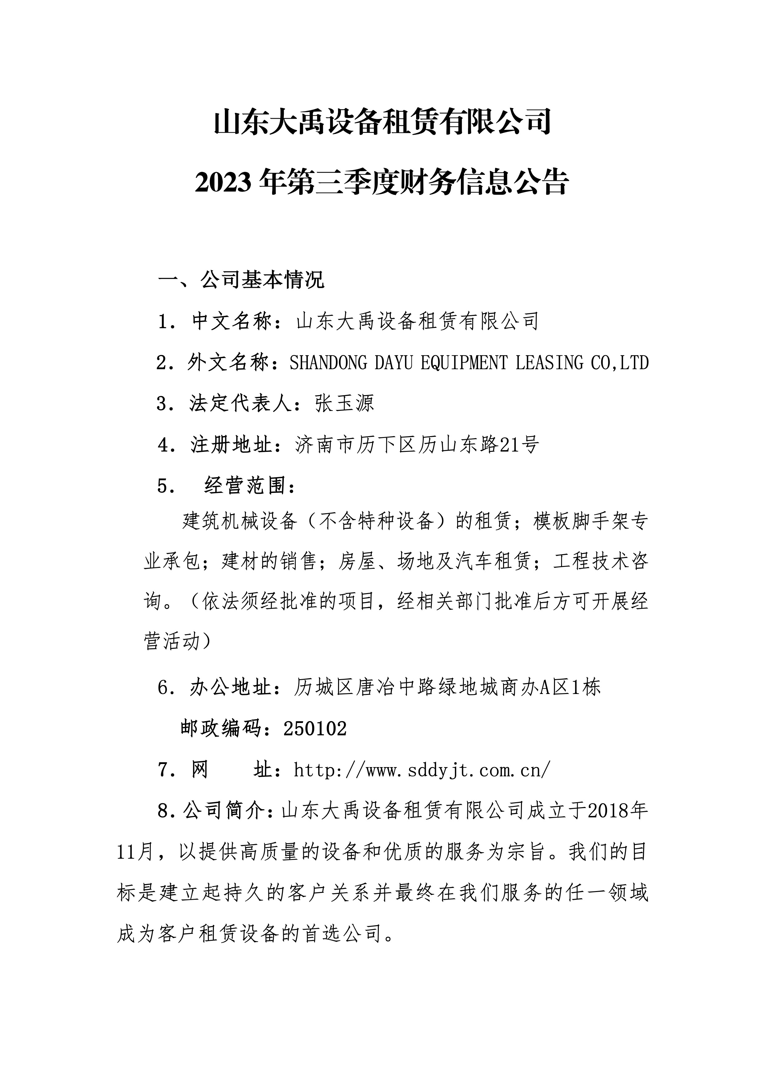 山東大禹設(shè)備租賃有限公司2023年第三季度財務(wù)信息公告
