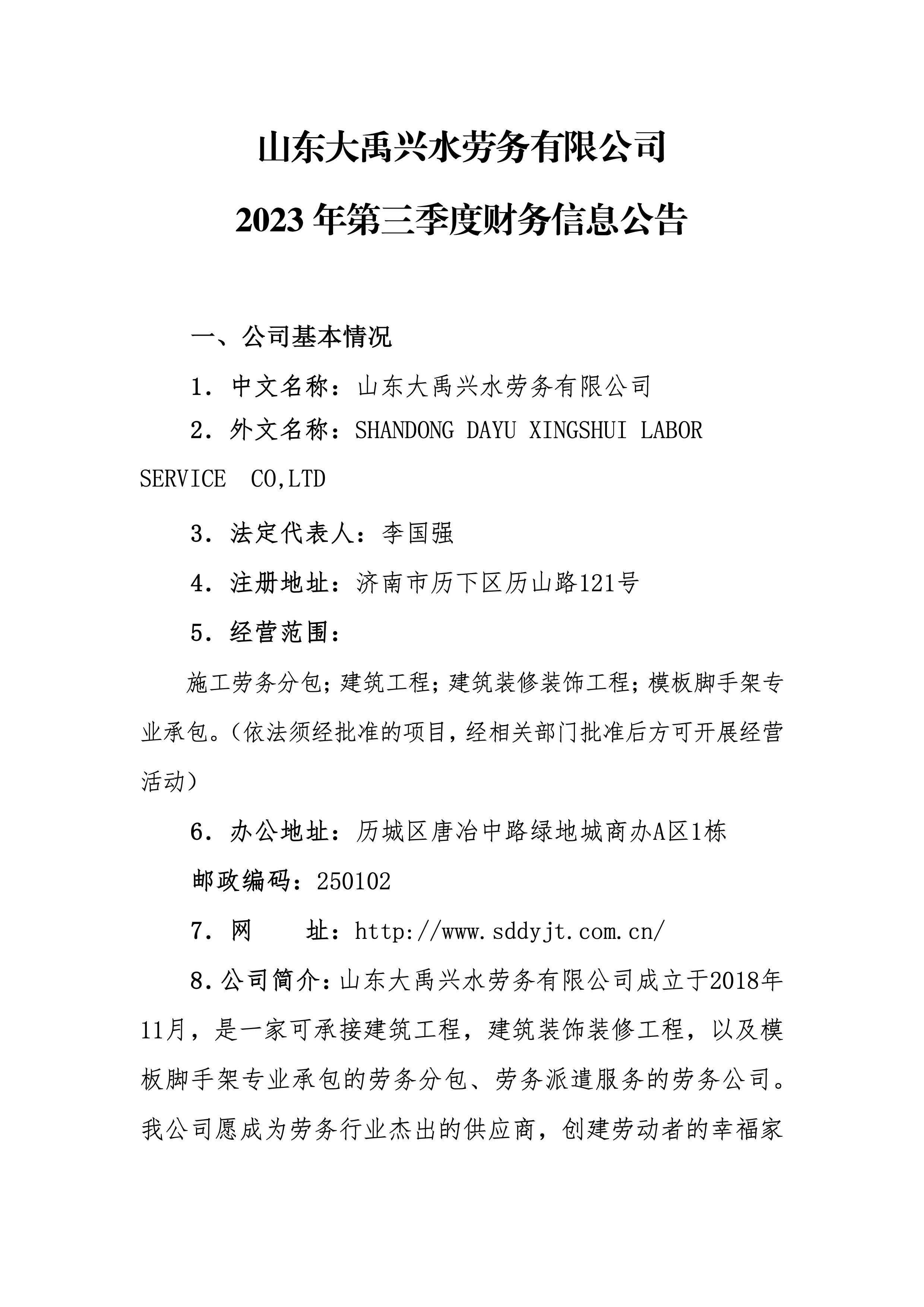 山東大禹興水勞務(wù)有限公司2023年第三季度財務(wù)信息公告