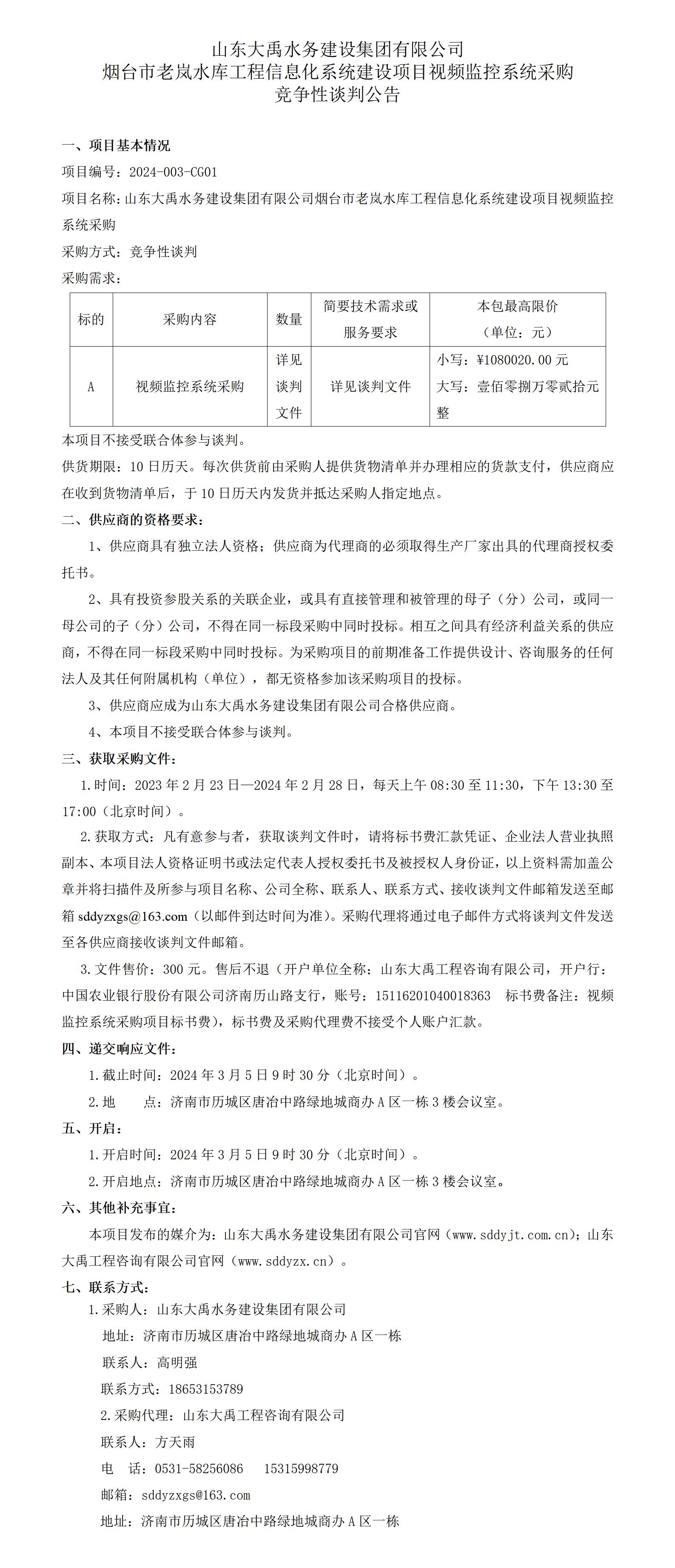 山東大禹水務(wù)建設(shè)集團(tuán)有限公司煙臺市老嵐水庫工程信息化系統(tǒng)建設(shè)項目視頻監(jiān)控系統(tǒng)采購競爭性談判公告