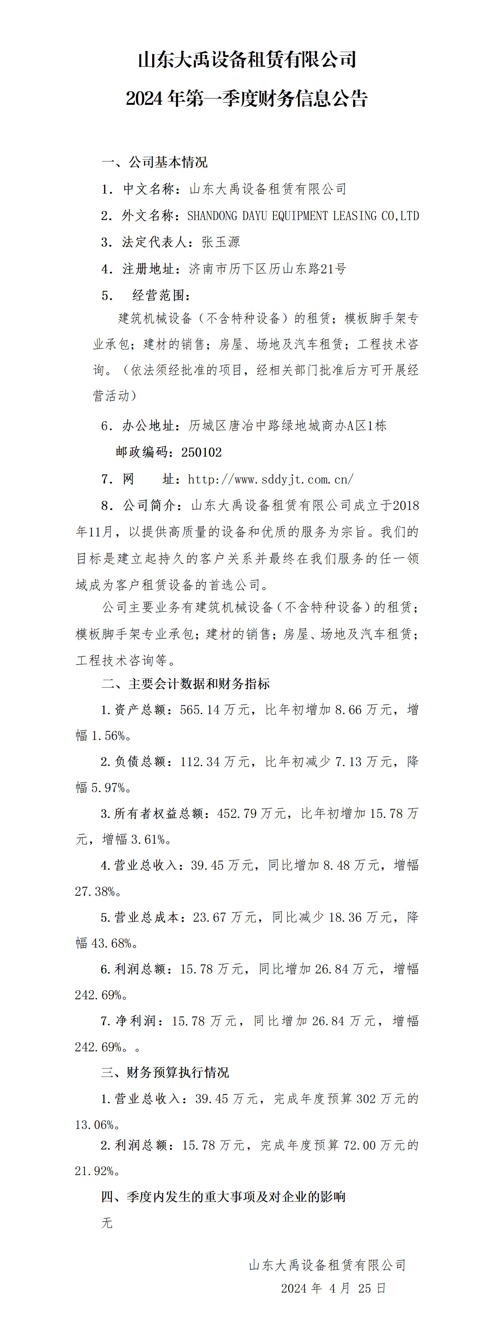 山東大禹設(shè)備租賃有限公司2024年第一季度財(cái)務(wù)信息公告