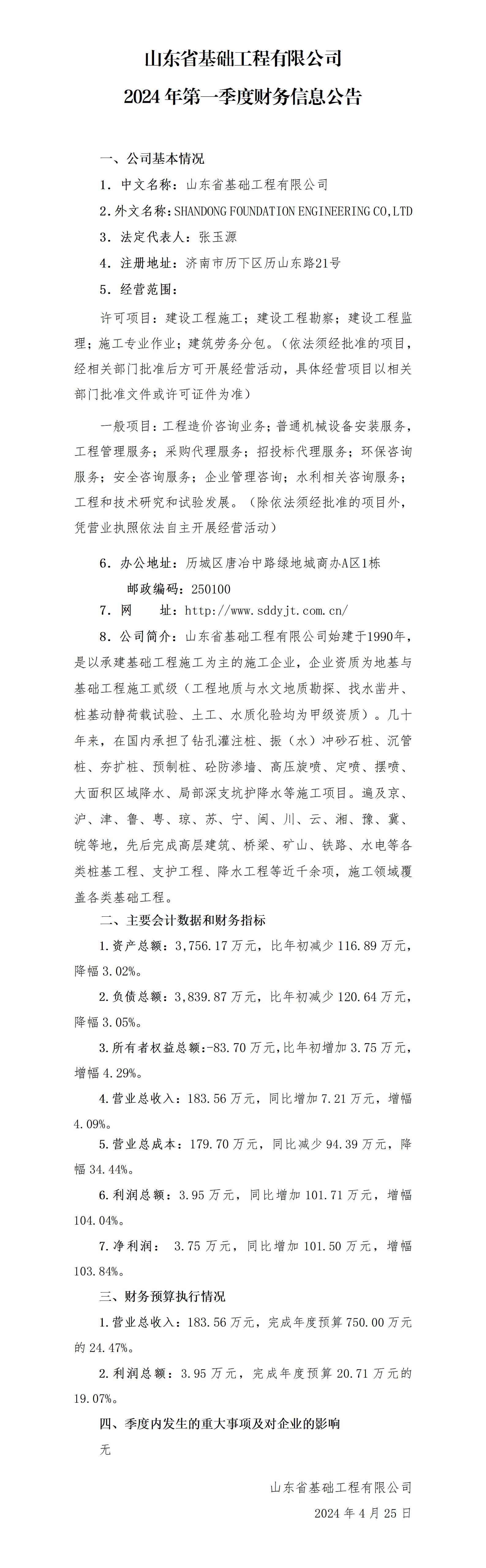山東省基礎(chǔ)工程有限公司2024年第一季度財務(wù)信息公告