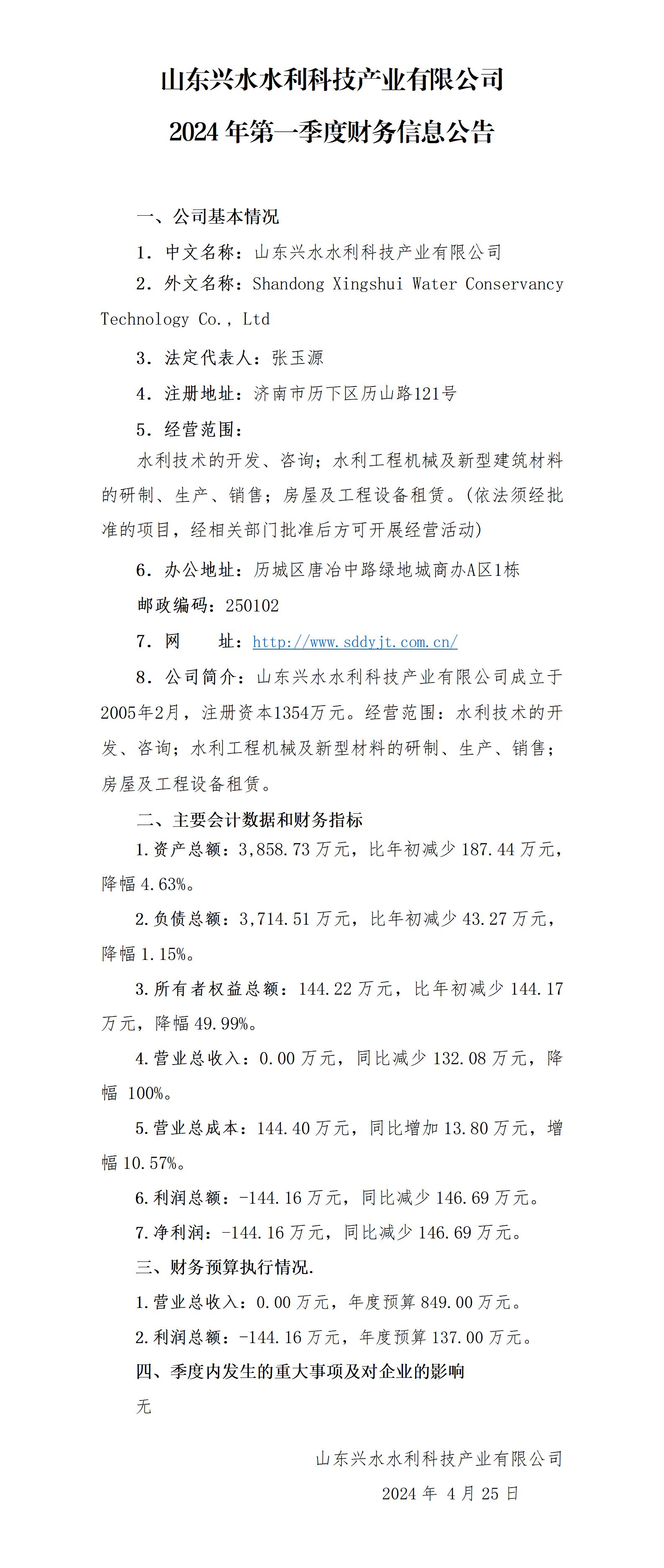 山東興水水利科技產(chǎn)業(yè)有限公司2024年第一季度財務(wù)信息公告