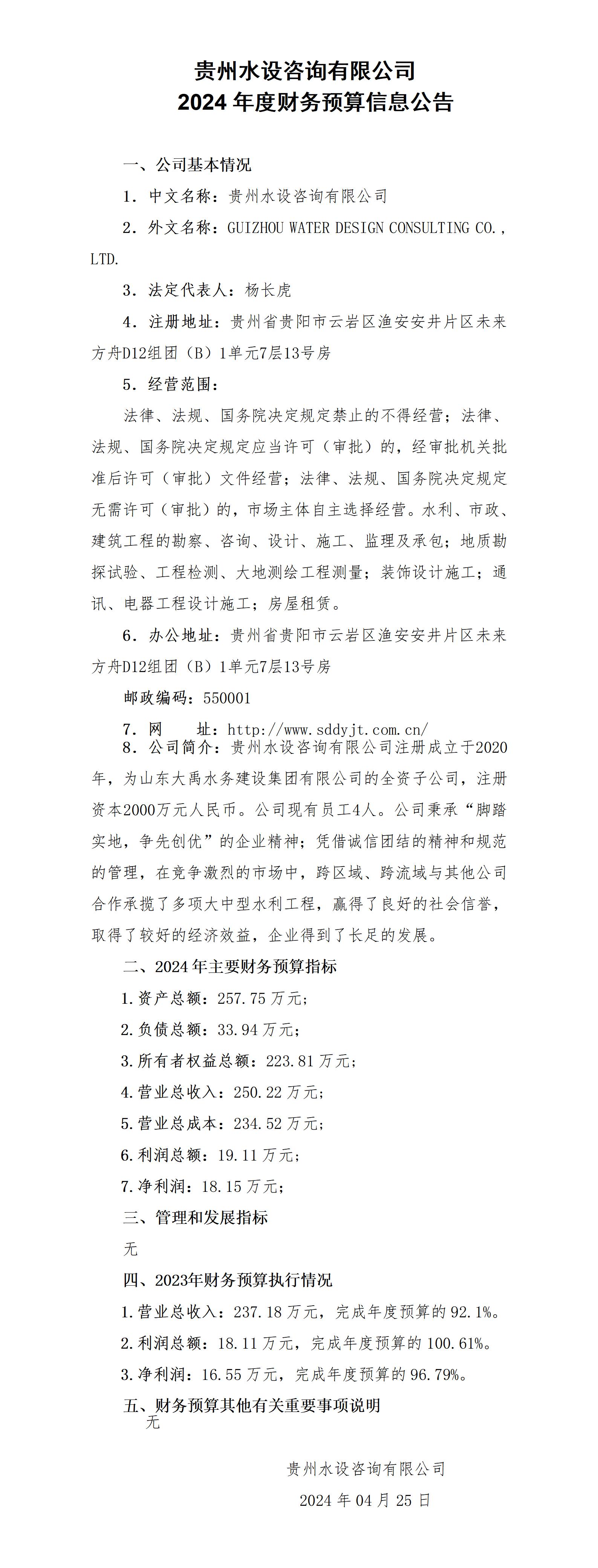 貴州水設(shè)咨詢有限公司2024年度財(cái)務(wù)預(yù)算信息公告