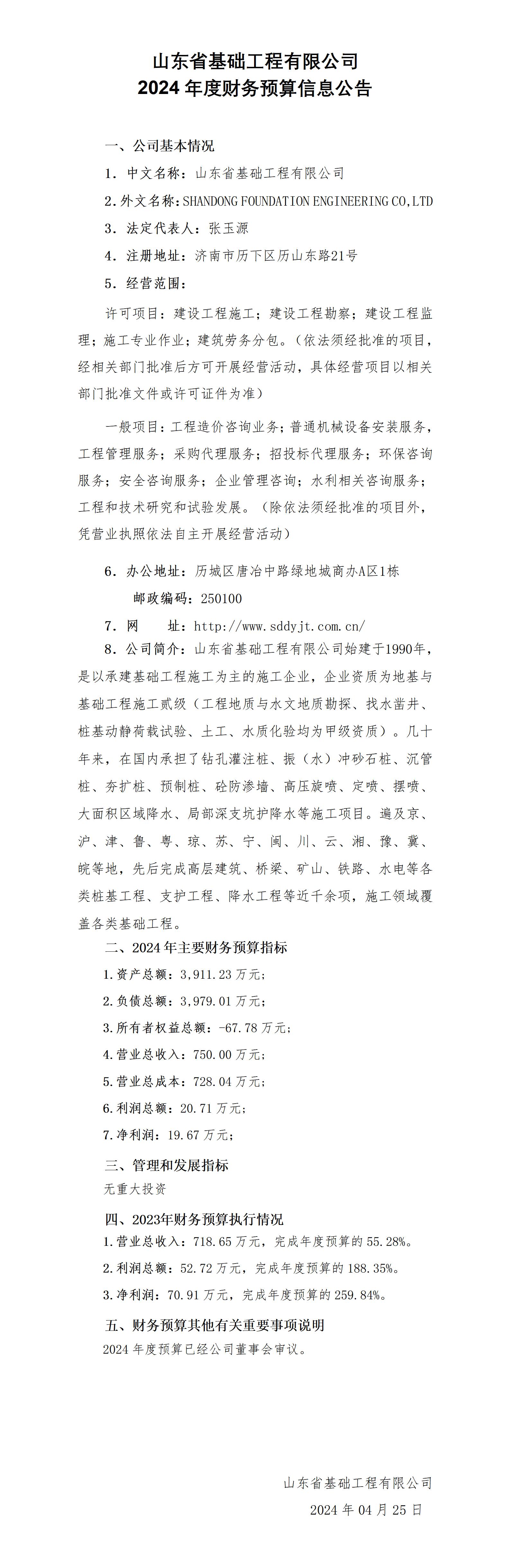 山東省基礎工程有限公司2024年度財務預算信息公告