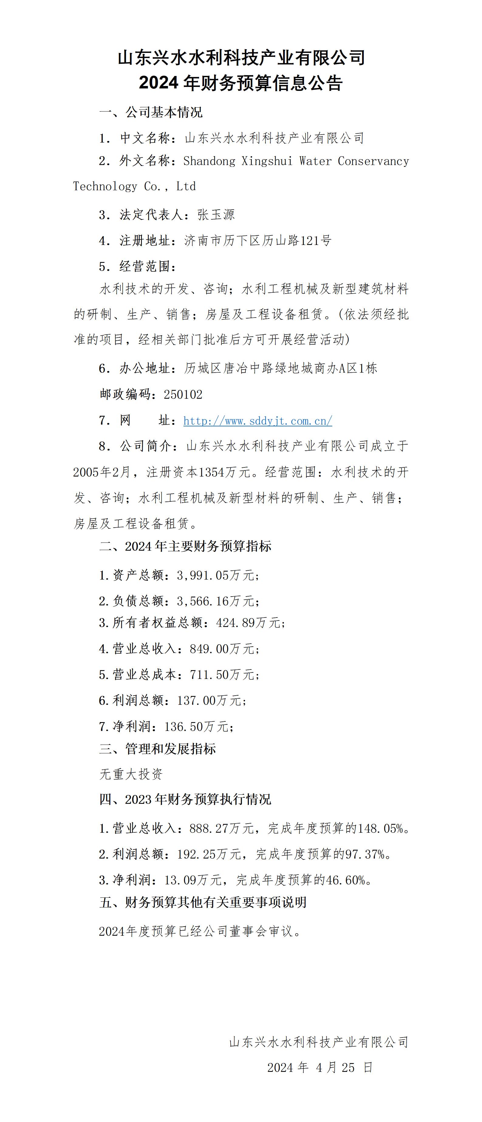 山東興水水利科技產(chǎn)業(yè)有限公司2024年財(cái)務(wù)預(yù)算信息公告