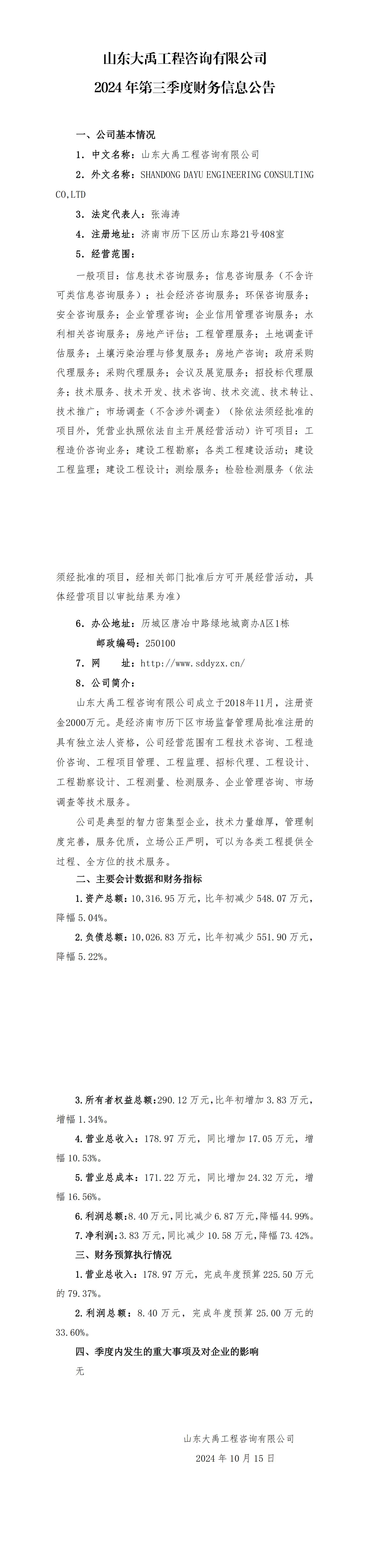 山東大禹工程咨詢(xún)有限公司2024年第三季度財(cái)務(wù)信息公告