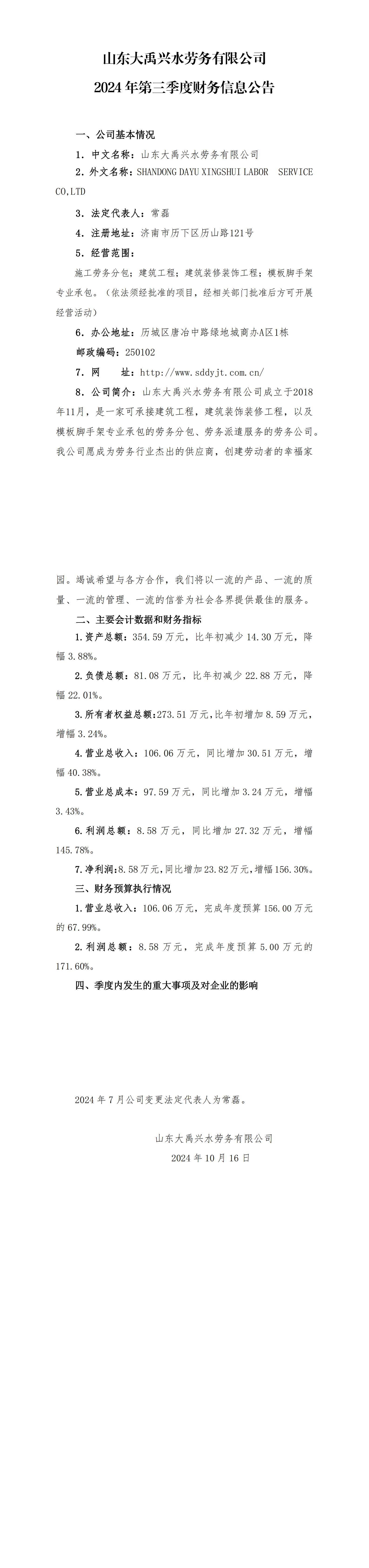 山東大禹興水勞務(wù)有限公司2024年第三季度財(cái)務(wù)信息公告