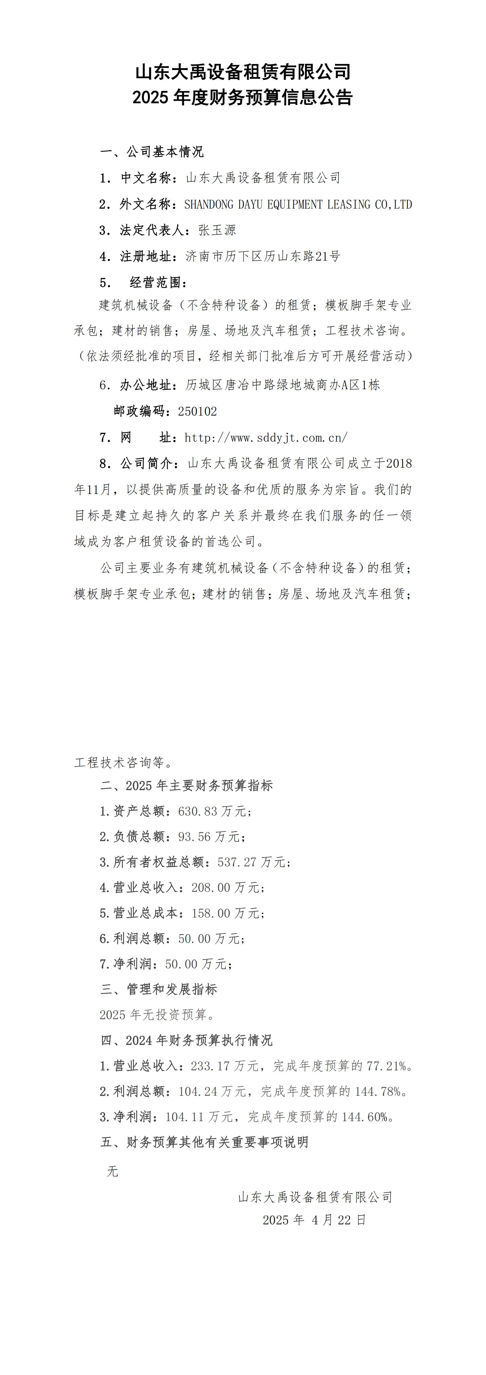 山東大禹設(shè)備租賃有限公司2025年財(cái)務(wù)預(yù)算信息公告