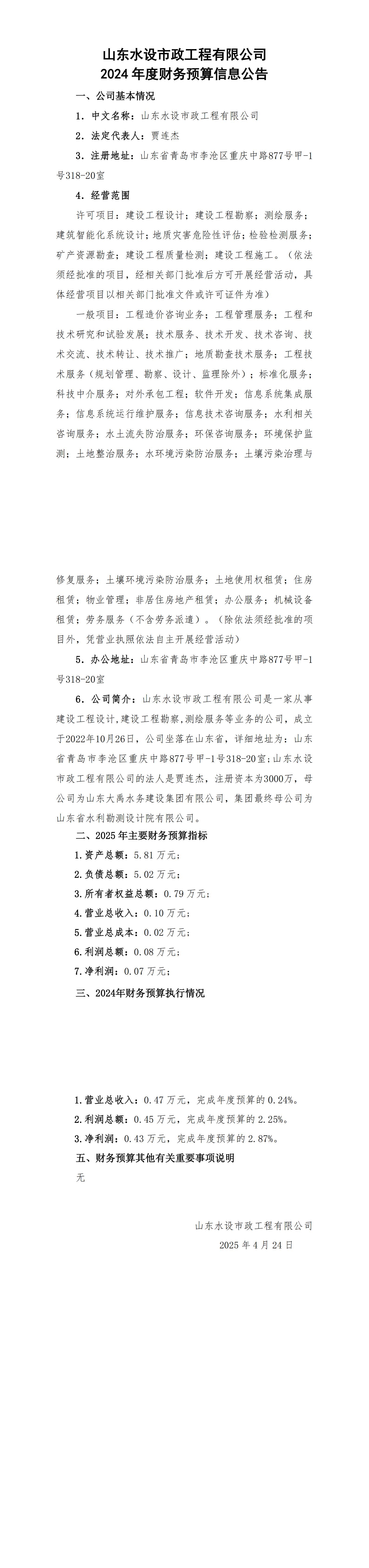 山東水設(shè)市政工程有限公司2025年財(cái)務(wù)預(yù)算信息公告
