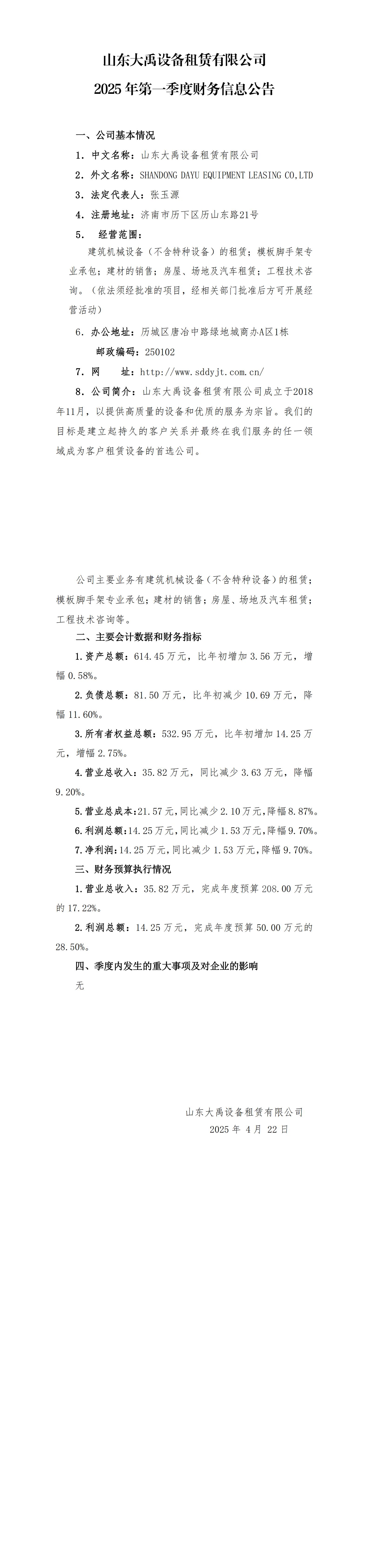山東大禹設(shè)備租賃有限公司2025年第一季度財務(wù)信息公告
