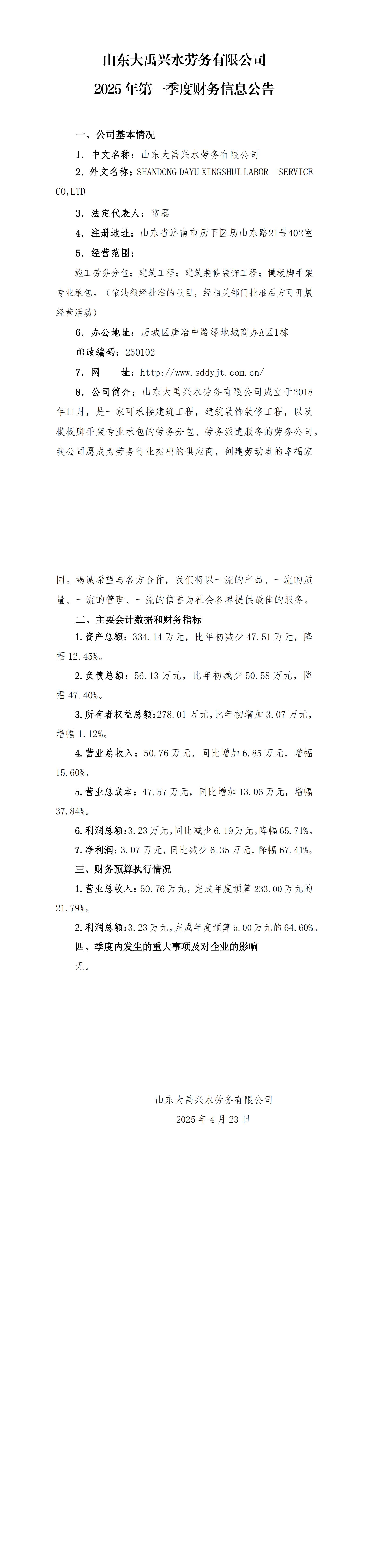 山東大禹興水勞務(wù)有限公司2025年第一季度財務(wù)信息公告