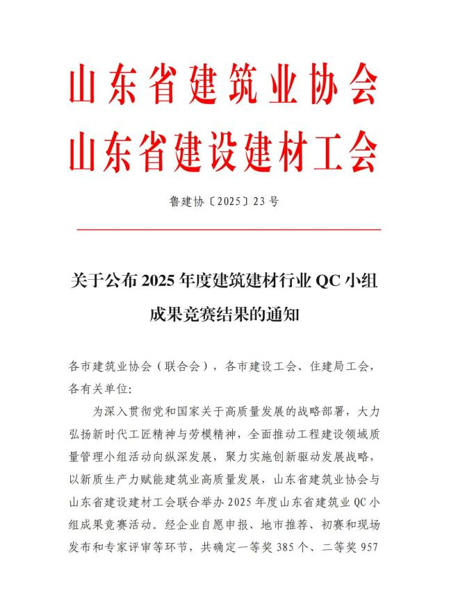 近日,山東省建筑業(yè)協(xié)會(huì)公布2025年度建筑建材行業(yè)QC小組成果競賽結(jié)果,集團(tuán)公司申報(bào)的“提升混凝土廊道施工外觀優(yōu)良率”等6項(xiàng)成果經(jīng)過申報(bào)、地市推薦、初賽、現(xiàn)場發(fā)布和專家評審等環(huán)節(jié),1項(xiàng)榮獲一等獎(jiǎng)成果,5項(xiàng)榮獲二等獎(jiǎng)成果。