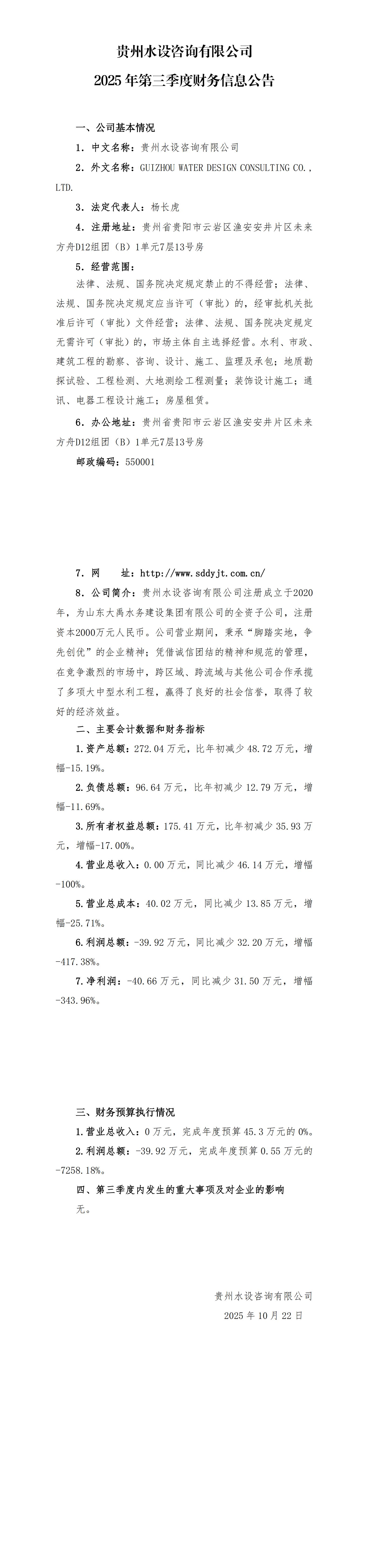 貴州水設(shè)咨詢有限公司2025年第三季度財(cái)務(wù)信息公告