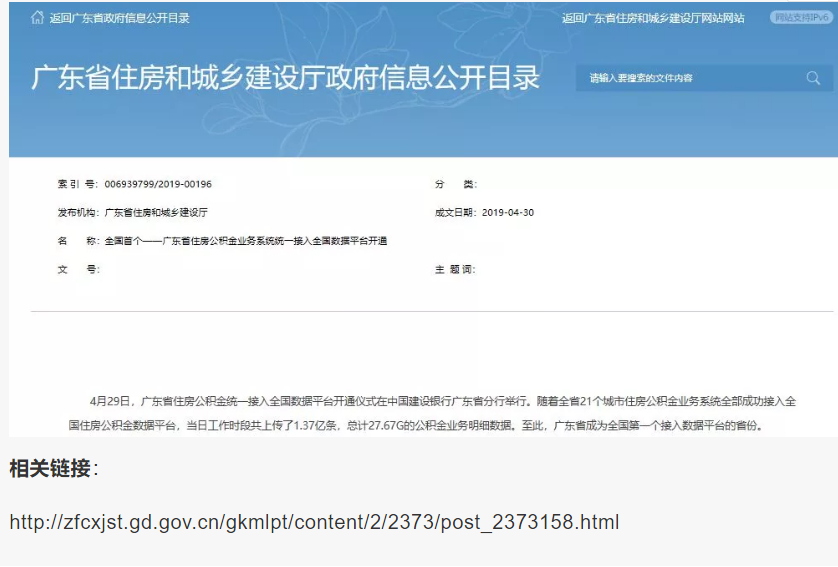 4月30日,廣東省住建廳官網(wǎng)發(fā)布了該省住房公積金業(yè)務(wù)系統(tǒng)統(tǒng)一接入全國數(shù)據(jù)平臺開通的新聞。廣東省成為全國第一個接入數(shù)據(jù)平臺的省份。